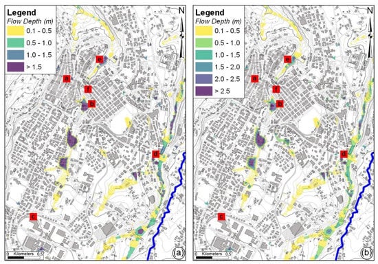 The numerical model provided the maximum flow depth, and this parameter was used to identify the expected flood areas in the basin and to verify the previous geomorphological data and the field investigations of critical areas.