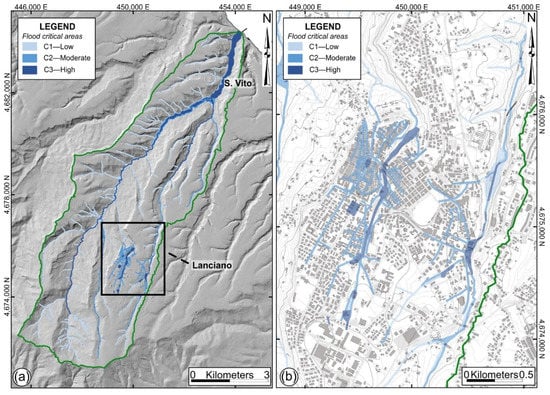 This stepwise analysis led to the definition of a multilayer geodatabase with geological, geomorphological, and hydrographic and hydrological data, which was the basis for the flood critical area assessment. The flood critical areas were defined through the analysis and overlay, supplemented using GIS software, of the data collected in the geodatabase. All the data were defined as polygon features, and linear features were buffered (5 m per side). An expert-based analysis of the overlaid data [87,88,89,90] allowed the design of a geomorphology-based matrix, which defined the criteria for the definition of the critical areas categories (low, moderate, and high). This matrix and the derived categories are not intended to represent a susceptibility or hazard distribution. They are aimed at the recognition of critical areas as possibly affected by flooding during heavy rainfall events, which have to be taken into account for alerting and civil protection purposes and actions. The combination of datasets provided by detailed fieldwork and flood modeling (direct investigations), and flood events and hazard datasets from previous investigations (indirect analysis), through the matrix, allowed the derivation of the map of the flood critical areas. Specifically, it was compiled by overlaying flood hazard maps [58], filings and reports of floods [59,72], detailed field surveys of previously flooded areas, detailed mapping of the drainage network, and data derived from the hydrological modeling. The field survey and mapping supported the definition of critical sites and the verification of the modeling. Finally, all the collected data were integrated into the GIS software through a cartographic overlay process in order to portray the spatial distribution of the flood critical areas.