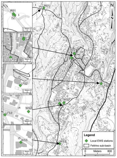 The assessment of the main critical areas was the basis for implementing a real-time flood gauge and sensors network in the municipality of Lanciano. This urban network was set with the installation of measuring instruments (temperature–rainfall gauges, weather stations, hydrometers, flooding gauges) and the connection of existing ones (i.e., weather gauges, etc.). It is also able to integrate other types of sensors (e.g., inclinometers, landslide monitoring systems, anemometers, etc.), allowing for the implementations of new types of warnings. This network integrates at the urban and drainage basin-scale, the regional meteorological one (Functional Center and Hydrographic Office of the Abruzzo Region), which already exists in the area. The positioning and arrangement of the gauge network were strictly based on the official hazard areas [58], on the analysis of the basin-scale/urban critical areas defined in the Lanciano area, and on detailed direct field observations. This network allowed us to set up an EWS that can respond to local needs and can support the existing regional one (Allarmeteo) and the planned national one (ITallert).