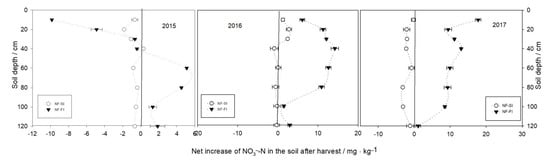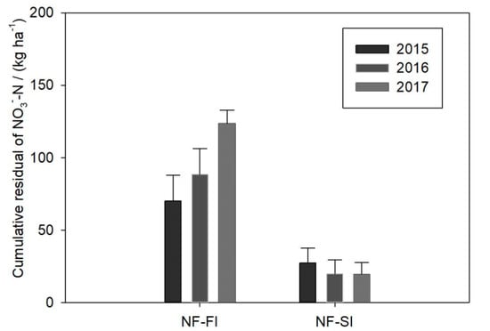 3.4. Cumulative Residual of NO3−-N in the Soil of 40–120 cm after Harvesting Potatoes