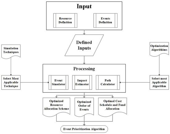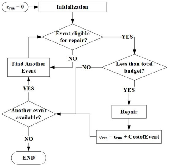 Figure 6 further illustrates the form of updating the equations of the solution. Initially, erun is equal to zero and, after initialization, the first event is selected. If the event meets the repair criteria, then it is repaired and its cost is added to erun, which continues to update itself based on this criterion until it meets the budget constraint or finds no more available events for repair. Similarly, time is updated with the same fashion using the variable trun, which keeps on selecting and updating events simultaneously with erun. If one event does not meet the criteria of both equations, then the event is dropped, and the code would try to find another event that fits the criteria.
