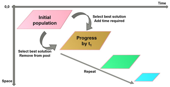 - Time-Bound—In this approach, it is mainly assumed that energy (fund) is abundant but time is scarce. Thus, a time limit (T) exists, forcing the algorithm to stop after the running time (trun) reaches the time limit (T). Thus, the main aim of the algorithm is to maximize the benefit-to-cost ratio within the time limit regardless of cost. In Equation (12), the previously mentioned conditions and goals can be summarized by an optimization equation.