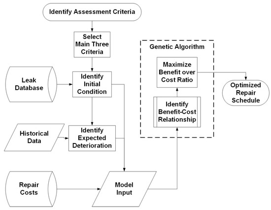 Figure 7 displays the methodology used to develop the genetic algorithm model for prioritization. The first stage was to identify the main assessment criteria via literature review and common practices. The second stage was to select the three main criteria for assessing each repair event. The next step was to identify the initial condition of each leak and then, based on historical data, to predict the decay and deterioration equations of the leak as a function of time. Furthermore, leak costs and repair costs were identified to finalize the process that defined the inputs. Before launching the genetic algorithm model, the benefit–cost relationship amidst the defined criteria should be identified to be maximized. For this model, a fundamental relationship between the cost and the factors was developed and is illustrated in Equation (16); the equation assuming that a leak is repaired in the best state and what remains is savings and benefits. The factors L, M, and N represent the adjustment factors for a specific measure and are used to identify the impact of each factor on the benefit–cost relationship [25,26].
