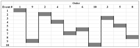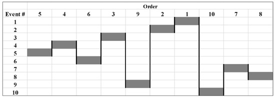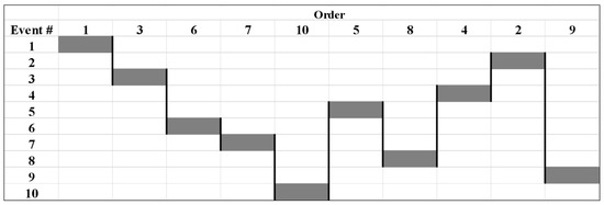 To establish an equal ground for comparison with the GA model, only one serpent was utilized. Since only one serpent was utilized, all events can be considered all-serpent events. Based on that, the optimized schedule and repair order for the maximized benefit-to-cost ratio is shown in Figure 9, where the optimal order of the previous example is displayed as the following order of events: 1, 3, 6, 7, 10, 5, 8, 4, 2, and 9.