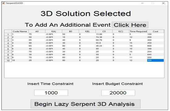 The Lazy Serpent Algorithm is compared to the genetic algorithm using the same sample data in the previous section. Multiple instances of the Lazy Serpent Algorithm are run with different selection criteria definitions. The aim is to explore the aspects of the lazy serpent and see the extent of its power as a prioritization algorithm. Figure 10 displays the interface of the lazy serpent software developed using MATLAB which is produced by MathWorks in Massachusetts, USA. The interface consists of multiple parameters, first the codename where the user inputs the name of the event to be scheduled. The codename can be numeric or alphabetic or a mixture of both. The next set of parameters is A0, B0, and C0, which represent the initial condition upon the discovery of the event at the point of assessment. The second set of variables is f(A), f(B), and f(C), which represent the change in the condition of each event. In this example, all events deteriorate in one plane and the deterioration function is −0.08 *t. Moreover, two variables to identify the required time and cost for each event are added under the tabs Time Required and Cost. Finally, the constraints are added via the Time Constraint and Budget Constraint. The Lazy Serpent Algorithm is run with three different selection criteria: (1) the basic Lazy Serpent Algorithm, which consists of selecting the worst condition event each time and eliminating it; (2) the inverse lazy serpent, which selects the best event each time; and (3) the selective lazy serpent, which aims at selecting the most deteriorating event through projection. If two events have equal deterioration factors, the one with the lowest price will be selected; if the price is the same, then the algorithm will move to select the one with the minimum required time. If all factors of selection are equal, an event will be chosen randomly.
