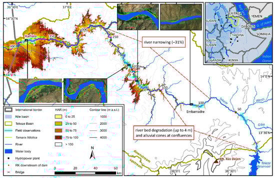 Location of the study area and representation of some of the main results (with RK = River Kilometer, HAR = Height Above the River within the Tekeze Basin and m ASL = meter above sea level).