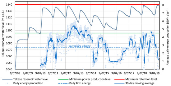 Evolution of the Tekeze Reservoir water levels from July 2008 and daily energy production from July 2010 to November 2019 (for this research, no energy production data are available before July 2010; Data source: [37,39]).