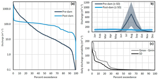 Hydrologic changes of the Tekeze River near the dam site: flow duration curves for average daily discharges (a), average pre-dam and post-dam monthly discharges (b) and daily post-dam variability in discharges for hydrologic year 2018, expressed as the observed maximum jump (Qmax–Qmin) and standard deviation in hourly discharges within a one day-timeframe (c) (Data sources: [38,39,49]).