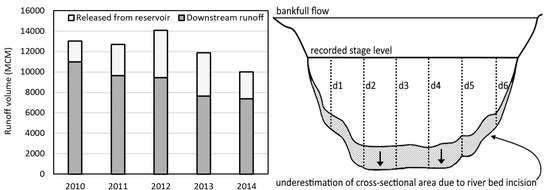 Around RK3, the Tekeze River incised at least 4 m after the dam became operational. Evidence for this was provided by a river terrace and several deep lateral gullies that were dated “pre-dam” and “post-dam” respectively during the field interviews (Figure 4). The height of the river terrace (and hence gully heads) was measured above the 2019 water level, and consequently provides a lower bound estimation. The rate of incision consequently was calculated as at least 0.4 m per year. Further downstream, the Tekeze River flows through a deeply incised gorge, where the absence of alluvial plains and river terraces makes it difficult to estimate incision rates. Near Embamadre (RK100), however, flow data potentially point out that the Tekeze River has incised up to there as well, although probably to a lesser extent. Since the dam became operational, the stage–discharge curve for the Embamadre station has not been updated. River bed degradation consequently could have led to an underestimation of actual discharges, and could be responsible for the observed decreasing trend in runoff volume downstream of the dam between 2010 and 2015 (Figure 5). During this period, no corresponding declining trend in reservoir inflow was observed—the inter-annual rainfall variability is expected to be similar as in the upstream catchment—and the extracted amount of water between the two stations is estimated to have remained invariable, as irrigated agriculture is absent along this stretch of the river [26]. In addition to river bed degradation, localized river bed aggradation also was observed in the first 150 RKs downstream of the dam. Over time, extensive alluvial cones have developed near the confluence of several large tributaries with the Tekeze River. Due to strongly reduced high flows and consequently reduced stream power [42], the Tekeze River has largely lost its ability to seasonally remove the debris cones of its affluents, usually consisting of large boulders with an average maximum diameter (D10) above 40 cm (42.7 ± 9.0 cm for n = 11). Therefore, in many places, the river has been “pushed” towards the opposite side of the valley, where it has further deepened its channel (see Figures in Section 4.4.2).