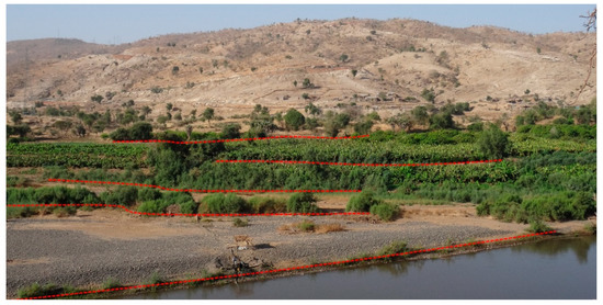 Since the Tekeze Dam became operational, the width of the active river bed has declined with on average 7% in the laterally confined areas (from 164 m to 144 m for RK0–RK80 and RK280–RK420) and 31% in the partly confined to unconfined areas (from 241 m to 162 m for RK80–RK280), where the bed gradient is low (0.98 m km−1 vs. 1.35 m km−1 for RK0–RK80 and 1.10 m km−1 for RK280–RK420) and the river has a lot of freedom to flow (Figure 6 and Figure S2). First, due to the clear water effect, the river has incised along the first 100 RKs downstream of the dam, leading to a reduced width/depth ratio and hence decreased required width to allow discharges of the same magnitude as compared to the pre-dam situation. Second, due to reduced high flows, increased low flows and changing water tables, riparian vegetation has expanded along the abandoned floodplains of the Tekeze River, with Tamarix nilotica as the dominant observed pioneer species. Different generations of tamarisk can be observed, with years-old trees located up to hundreds of meters away from the active river bed and young bushes of tamarisk located much closer to and even in the active river bed. Whereas the meters-high old trees indicate the pre-dam flooded perimeter, the young generation of tamarisk bushes indicates the (gradual) post-dam retreat of the maximum flooded perimeter (Figure 7). The presence of new tamarisk bushes triggers a continued narrowing of the river, as depositions are trapped more easily, allowing the accumulation of sediments (vertical accretion) and hence stabilization of the largely abandoned floodplain [45,46]. Third, dam-induced reduced high flows and increased low flows have also caused humans to increasingly occupy floodplains for irrigated agriculture. Since the Tekeze Dam became operational, the irrigated area along the river has expanded from 433 ha to 1698 ha, mainly consisting of fruit plantations, and even the lower river terraces have become cultivated [26]. Similarly to natural vegetation expansion, fruit trees reduce flow velocity during floods, what leads to sediment trapping and temporary runoff storage. Fourth and last, to better protect their fruit plantations, some farmers plant the fast-growing elephant grass (Pennisetum purpureum) at the edge of the river bed, which leads to increased bank stability [50] and hence accelerated river narrowing. Although the narrowing of the river is initially dam-induced, it is accelerated by the expansion of riparian vegetation and anthropogenic land use changes.