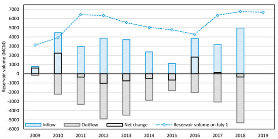 Yearly reservoir volume inflow and outflow, with corresponding net volume change from July 2009 to November 2019 (Data sources: [37,39,40]).