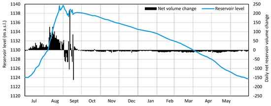 Evolution of the reservoir water levels and daily volume changes for hydrologic year 2018 (Data sources: [37,39,40]).