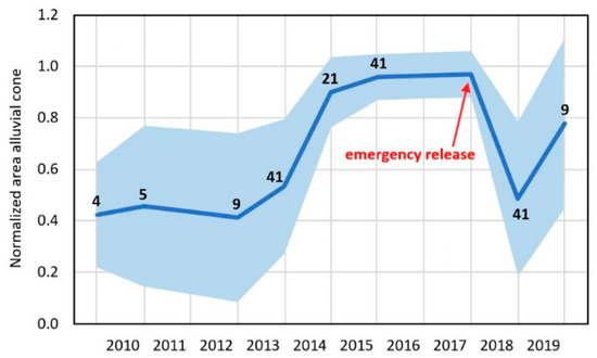 Evolution in the normalized area of alluvial cones—calculated as a fraction of the maximum extent of the alluvial cone—up to RK150. A total of 41 alluvial cones were mapped at different time steps according to the (non-continuous) availability of high-resolution satellite images in Google Earth (no data were available for hydrologic years 2011, 2016 and 2017). The number of studied alluvial cones is indicated for each time step.