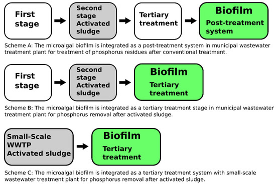 Designs for microalgal biofilm integration into conventional wastewater treatment systems. Scheme A: The microalgal biofilm is integrated as a post-treatment system in a municipal wastewater treatment plant for the treatment of phosphorus residues after a conventional treatment. Scheme B: The microalgal biofilm is integrated as a tertiary treatment stage in a municipal wastewater treatment plant for phosphorus removal after the activated sludge process. Scheme C: The microalgal biofilm is integrated as a tertiary treatment system in a small-scale wastewater treatment plant for phosphorus removal after the activated sludge process.