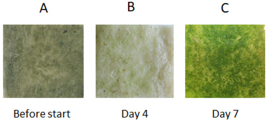 Growth of the microalgal biofilm assemblage on the geotextile cultivation surface before and during the experiment (after 4 and 7 days). The size of the geotextile patches was 3 × 3 cm. (A) Geotextile cultivation surface before the experiment. (B) Geotextile cultivation surface after 4 days of the experiment. (C) Geotextile cultivation surface after 7 days of the experiment.