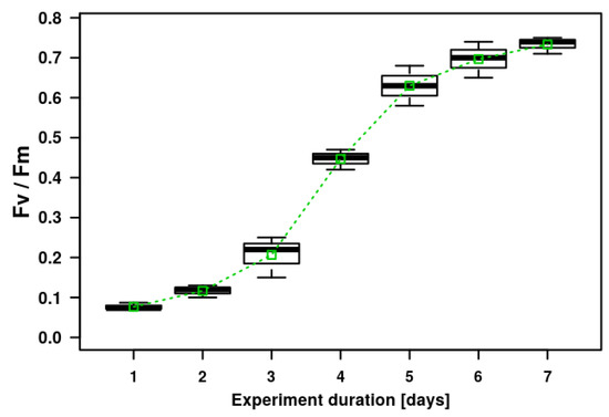 Microalgal biofilm growth on geotextile patches placed in artificially prepared wastewater during laboratory cultivation in Erlenmeyer flasks. The growth is expressed as the chlorophyll fluorescence parameter Fv/Fm. The graph shows the means (small open green boxes), median values of the second quartile (thick black lines), upper and lower quartile (boxes with 50% of measured data) and error bars with the upper and lower extreme values indicated.