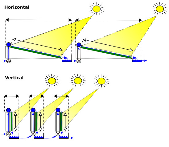 The theoretical scenario for the microalgal biofilm module proposes a rectangular cultivation area with the dimensions of 2 × 10 m (Table 2). The assumed minimum distance between the modules is 0.2 m. The module of a concrete-based biofilm system consists of a slightly inclined concrete cultivation area with the wastewater circulating through the cultivation area from a reservoir (Figure 4—Horizontal). This theoretical scenario is derived from a functional prototype microalgal biofilm system with an 8 m2 concrete cultivation area presented in our previous studies [27,33].