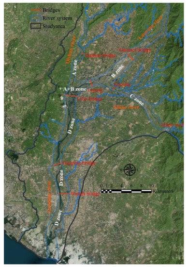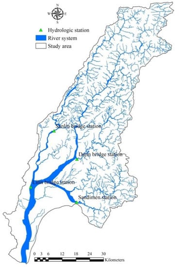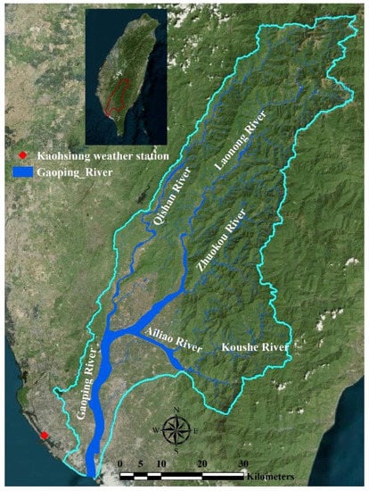 Gaoping River, which is the largest river in Taiwan, was used for the analysis. It is located in the southwest of Taiwan and has a total length of 171 km, covering 3257 km2. It originates from west of the Central Mountain Range near Yushan. The upstream end is connected to Laonong River, and its main branches include Qishan, Ailiao and Zhuokou (Figure 1). The topographic height varies significantly, descending along the direction from northeast to southwest, with a maximum difference of nearly 4000 m. The area above 1000 m accounts for 47.45% of the total drainage basin, that between 100 and 1000 m accounts for 32.38% and finally, the area below 100 m accounts for 20.17%. The average slope of the river bed is approximately 1/150, with 1/15, 1/100 and 1/1000 for the upstream, midstream and downstream sections, respectively. Additionally, the sections’ lengths are 37, 68 and 66 km for the upstream, midstream and downstream sections, respectively.