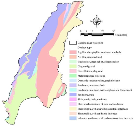The Gaoping River basin is among the worst basins in Taiwan in terms of sediment yield and is highly vulnerable to sediment deposition. Statistical data from the Water Resources Agency of Taiwan, MOEA, estimate a total dredging sediment volume of 94,780,000 m3 for Gaoping River basin between 2009 to 2014 [22]. The major contributions to such high rates include the high-slope landform and concentrated precipitation. The geological map in Figure 2 shows that the watershed mainly constitutes sand gravel and sandstone, rendering it vulnerable to erosion. Stefanidis and Stathis [6], in their assessment of soil erosion in a catchment, showed that vulnerable geological subsoil and the steep slopes favor the development of erosion phenomena. At Gaoping, about 80% of the annual precipitation is from an average of 3–4 typhoons per year [21], which fall between June and September each year. Precipitation in these events is characterized by high intensity and short duration, leading to enormous volumes of sediment yield. The situation is even worsened by additional factors, such as climate change, which has caused drastic changes in precipitation [23].
