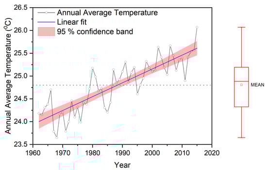 Changes in annual average temperature recorded by the Kaohsiung weather station, 1960–2016.