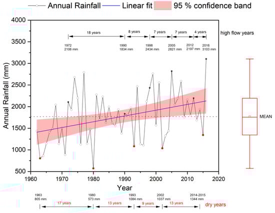 Changes in annual precipitation recorded by the Kaohsiung Weather Station, 1960–2016.