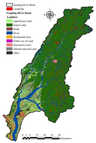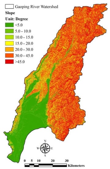 Figure 5, Figure 6 and Figure 7 show the Digital Elevation Model (DEM), soil map and land use maps of Gaoping River Basin, respectively. The basin ranges from 0 m to more than 3000 m above sea level and is dominated mostly by forest land at elevations higher than 500 m. Based on the DEM, land use, soil maps, road system maps, and slope maps (Figure 8) the basin was divided by Esri ArcMap 10.7 into 17,635 computational cells for further analysis.