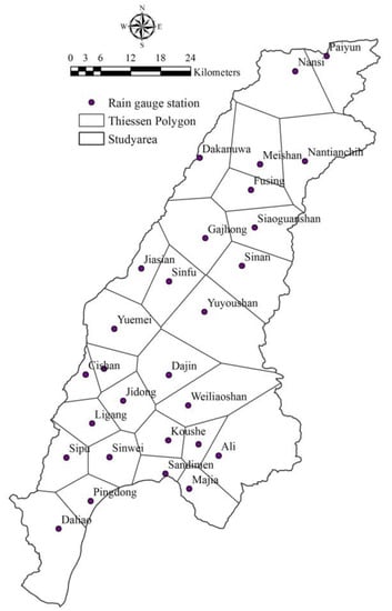 In the basin, there are 28 precipitation monitoring stations established by the Central Weather Bureau; however, they are not evenly distributed. In order to minimize computational errors, we applied the Thiessen polygons method to determine the controlling area of each precipitation monitoring station. The reader should note that the Thiessen polygons were not used to derive the weighted precipitation. Instead, precipitation data for each station were used as the precipitation volume of computed cells in the control area for the same precipitation monitoring station (Figure 9).