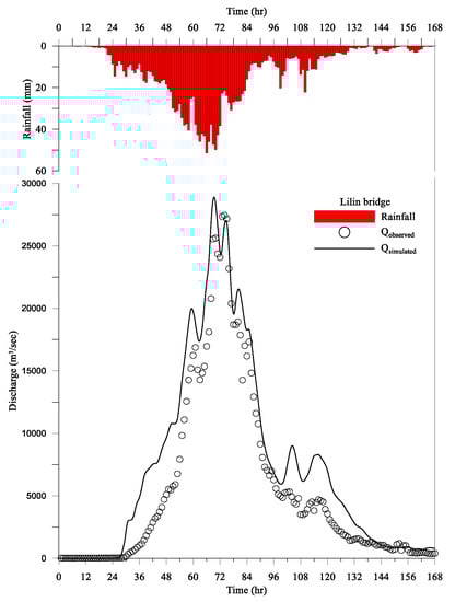 Simulated and observed discharge during Typhoon Morakot in 2009 at Lilin Bridge station.