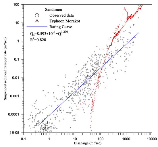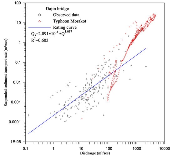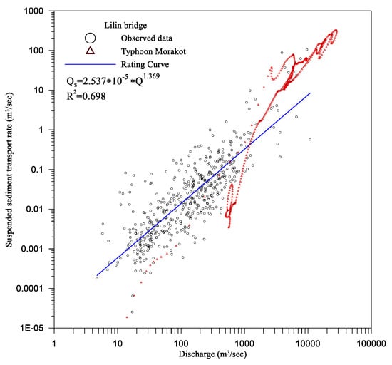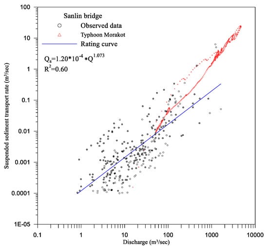 Since the hydrological monitoring stations along the Gaoping River system do not have suspended load concentration data hydrographs, the historical discharge and suspended load data from sediment monitoring stations downstream of the main branch of the Gaoping River were used to establish the correlation between discharge and sediment transport volume of each hydrological monitoring station. These served as the basis for validating the suspended load concentration hydrograph obtained from the numerical model. The simulated discharge and suspended load transport rate under Typhoon Morakot in 2009 were plotted onto the correlation diagram between the observed discharge and sediment transport rate for the Sanlin, Dajin, Sandimen and Lilin bridge Stations (Figure 12, Figure 13, Figure 14 and Figure 15). In these figures, points are actual historical measured data. The solid line represents the regression relation between discharge and sediment transport rate for each hydrological monitoring station. It is noted from the figures that the simulated correlation between discharge and sediment transport rate was consistent with the correlation between discharge and sediment transport rate of the actually observed data for all monitoring stations except Lilin Bridge station, particularly under high discharge. The model slightly overestimated data at this station (Figure 15). Nonetheless, the model also indicated reasonable estimates on suspended load and suspended load transport.