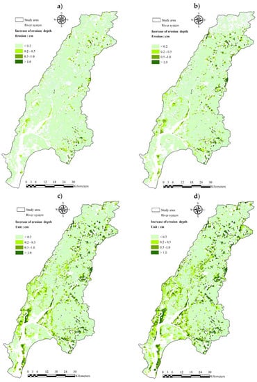 Spatial distribution of erosion depth increase under the influence of climate change under (a) 10 year, (b) 25 year, (c) 100 year and (d) 200 year return periods.