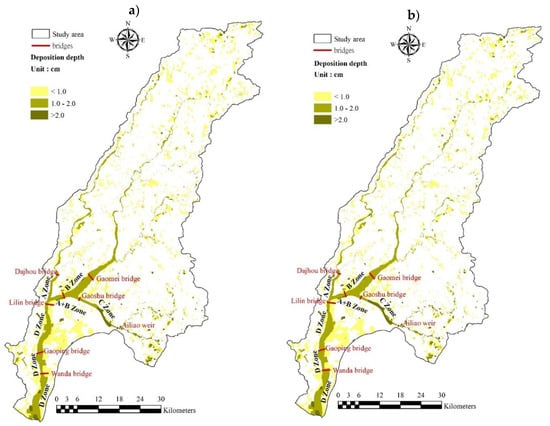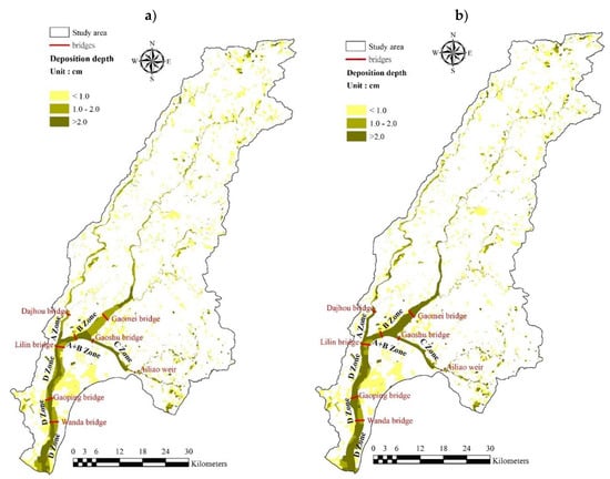 Deposition depth distribution under 10 year return period for (a) baseline and (b) climate change scenarios.