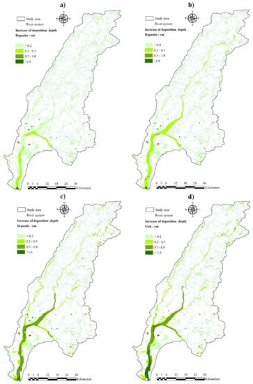 Figure 20 shows the spatial distribution of deposition depth increase under the baseline and climate change scenarios. Similar increase patterns were observed between the simulated cases, with a larger deposition depth increase located in the middle and downstream of river channels. Deposition depth increase was highest in the main channel as expected, and increased with increasing return periods indicated by dark green areas in Figure 20.