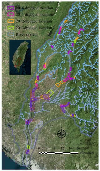 Dredged locations in Gaoping River basin from 2010 to 2013.