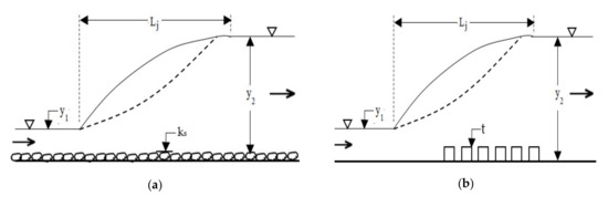 Sketches of hydraulic jump over the rough bed: (a) natural rough bed and (b) artificial rough bed.