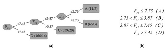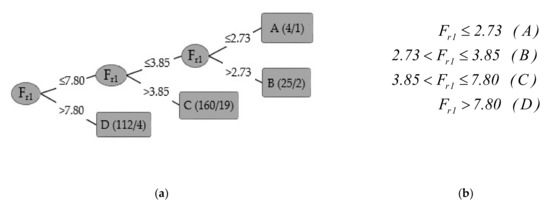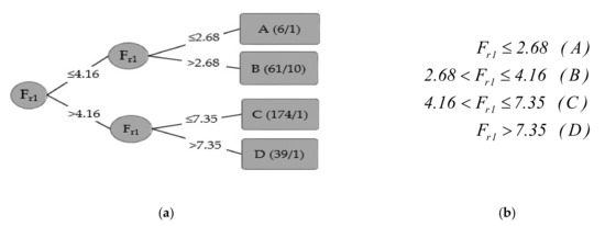 In the artificial bed, the decision tree classifier model also has four leaves and correctly classified about 91% of the data (i.e., 91.36%, Table 2). Under this condition, the accuracy of the classifier was reduced due to the different hydraulic and geometry condition in the dataset. The decision tree and classification chart of the hydraulic jump on an artificial rough bed is provided in Figure 3a,b, respectively. In Figure 3a, the numbers in brackets (e.g., 4/1 for class A) stands for the total number of data (e.g., 4) and the false classifications (e.g., 1) falling in each class, respectively. Results indicate that, for class A, the Froude number reached 2.73. In the second class (B), the upper value of Fr1 reached 3.85 (2.73 ≤ Fr1 ≤ 3.85). A comparison of Figure 2 and Figure 3 indicates almost the same value of the Froude number for classes A and B on artificial and natural beds. In the third class (C), the upper value of Fr1 increased from Fr1 = 7.35 on natural beds to 7.80 with artificial rough beds.
