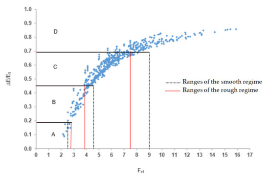 Variation of ∆E/E1 versus Fr1 along with the ranges of smooth and rough regimes and hydraulic jump classes (A, B, C, D).