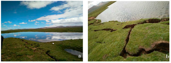 The Qinghai–Tibet Plateau (QTP), known as the “third pole” of the earth, is experiencing a faster and more sensitive increase in temperatures on account of climate change than other regions at similar latitudes [1]. Permafrost degradation in the QTP resulting from global warming in recent decades has considerably affected the hydrological and ecological processes [2]. Numerous studies have emphasized that it has led to variations in hydrological conditions and redistribution of the subsurface water in the QTP [3,4,5]. As a result of global warming and the spread of human engineering, the thickness of the active layers is increasing, while the underlying permafrost is disappearing. In the freezing and thawing process, underground ice undergoes continuous melting and freezing in the permafrost active layer, which reduces the stability of important projects in the QTP. Many geological landscape and disasters, such as thermokarst lakes (Figure 1a), thermokarst collapse (Figure 1b), and thermokarst flow, occur as a result of such transformations.