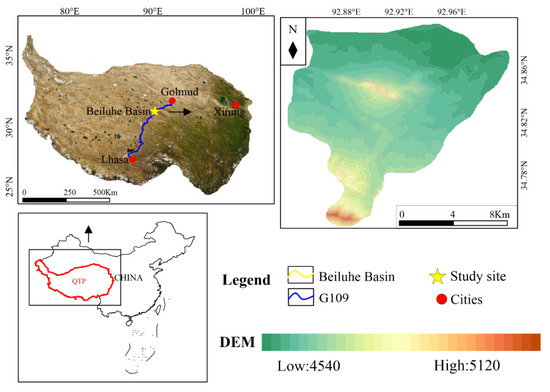 The hydrological regimes of thermokarst lakes in the QTP are expected to be varied and complex as a direct result of global warming, so studies need to be conducted at lake-specific levels to improve the comprehensive science-based monitoring programs for adequate assessment of the water balance and hydrological processes in the QTP [6]. Therefore, this study was conducted in the BLB, which is a typical complete watershed with a large distribution of thermokarst lakes and is located in Yushu Tibetan Autonomous Prefecture, Qinghai Province, China (Figure 2).