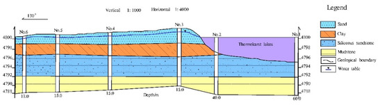 From top to bottom, the lithology of the sedimentary strata in the study area is as follows (Figure 3)—the Quaternary Holocene alluvial layer and the Neogene lacustrine sedimentary layer. The upper part of the Quaternary Holocene alluvial layer is composed of silt with a fine sand layer; it is brownish-red in color, with a thickness of about 0.5–3.5 m. Furthermore, the lower part is composed of a clay layer with a brownish-red color and a thickness of 1 m. In addition, the Neogene lacustrine sedimentary layer consists of mudstone and sandstone. Mudstone, the dominant lithology, is brownish-red with strong weathering and good fracture development. Sandstone, which is occasionally in the middle of the mudstone, is brownish-red, intensely weathered, and mostly calcareous argillaceous cementation. The depth of the upper permafrost limit is generally between 1.5 and 2.5 m, with a thickness of about 10–50 m.