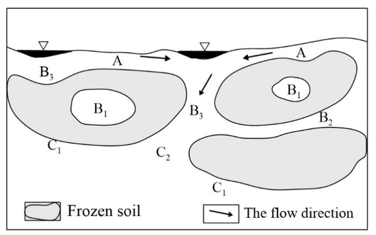 Schematic of groundwater types in permafrost areas [25]: (A) upper permafrost water; (B1) water in middle permafrost; (B2) water between permafrost layers; (B3) channel water of freeze–thaw zone; (C1) direct contact water in bottom permafrost; (C2) non-direct-contact water in bottom permafrost.