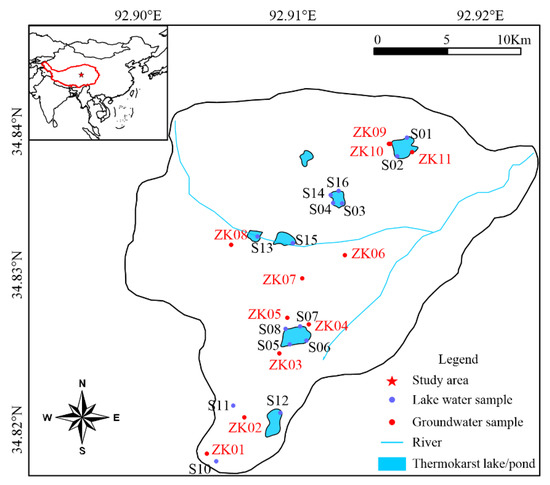 Studies on hydrochemistry and stable isotopes play a critical role in indicating both water origin and interactions of groundwater and surface water, thus making them significant in regional water resource management and economic development. The characteristics of water chemistry record information related to groundwater recharge source, migration, and circulation to some extent [10]. Therefore, understanding the hydrochemical characteristics of groundwater is key in determining groundwater quality and its recharge process [11]. Traditional hydrochemical methods such as Piper maps and Gibbs maps have been widely used to determine the hydrochemical characteristics and evolution of groundwater [12,13,14,15,16]. Stable isotope geochemistry plays a critical role in monitoring climate change with an accurate recording of paleoenvironment variations [17,18]. The δD and δ18O (which are both stable isotope tracers, effectively applying for identifying hydrological conditions) values are significantly affected by variations in the water source, topography, precipitation, and hydrological and climatic processes in both lakes and surround groundwater [19]. Thus, stable isotopes of δD and δ18O have a wide range of applications in evaluating the source and recharge of groundwater and indicating the interaction between groundwater and surface water in different regions. The δD and δ18O values and ion concentrations are useful tools for studying the hydrological processes of lakes on the Tibetan Plateau [20,21,22]. Wang et al. (2018) established stable isotope variations in three lakes of the QTP, suggesting that δ18O values were dominated by the evaporation/freshwater input ratios [20]. Gao et al. (2018) investigated a large number of thermokarst lakes and ponds in the QTP and found that the mean isotope compositions in these thermokarst lakes were −7.2‰ in δ18O and −58.0‰ in δD [21]. Yang et al. (2016) demonstrated that thermokarst lake water was contributed at a rate of 61.3% by the melting of ice-rich permafrost [21]. However, monitoring the lake hydrology in the QTP has proven to be difficult owing to logistical challenges and some uncertainties in the field while surveying [6]. Despite extensive studies having focused on hydrochemical processes and the stable isotope geochemistry of groundwater and lake water, the fundamental mechanisms responsible for the development and progression of thermokarst lakes from the above two perspective have not yet been fully elucidated.