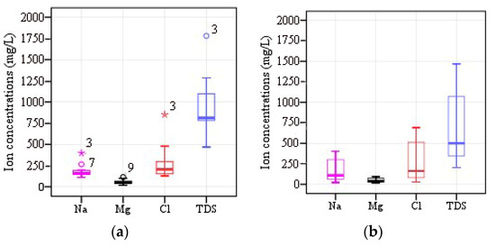 Box line diagram of major ions concentrations of groundwater (a) and lake water (b). (Since there is little difference in the other ion concentrations between the groundwater and lake water, only Na, Mg, Cl, and TDS data are selected for plotting.)