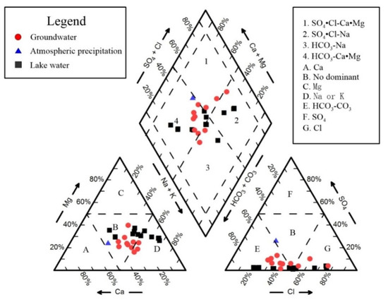 The Piper diagram and Durov diagram are both simple and widely utilized methods for determining the type of water [31]. A large number of water quality analysis data can be directly projected on the Piper diagram and the distribution of water sample points can be observed directly, which facilitates the analysis and interpretation of hydrogeochemical problems. The Piper diagram (Figure 7) indicates whether HCO3-CO3 type or Cl type are present in both the groundwater and lake water. Furthermore, there is no dominant cation type in the groundwater, while in the lake water there is either no dominant type or the Na type is dominant.
