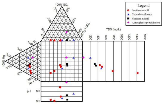 In order to directly analyze the basic hydrochemical characteristics of lakes, seven conventional ions, TDS, and pH indices were projected on the Durov diagram (Figure 8). The Durov diagram of the groundwater indicates that most of the southern groundwater samples correspond to the Cl–Na type, while most of the northern and central groundwater samples correspond to the HCO3·CO3–Na type. Furthermore, most of the southern lake water samples correspond to the Cl–Na type, while most of the northern and central lake water samples correspond to the HCO3·CO3–Na type (Figure 9).