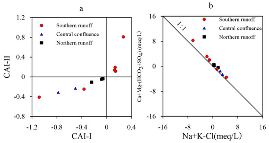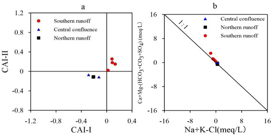 (a) CAI-I and CAI-II for (b) [(Ca+Mg)-(HCO3+SO4)] and [(Na+K)-Cl] in lake water.