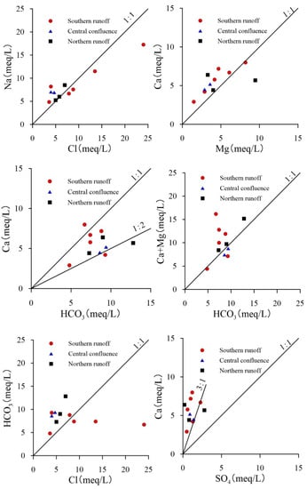 Ion ratio graphs have commonly been used to further determine the formation process and main hydrochemical components of the water samples [32]. The ion ratios of groundwater and lake water are shown in Figure 13 and Figure 14, respectively.