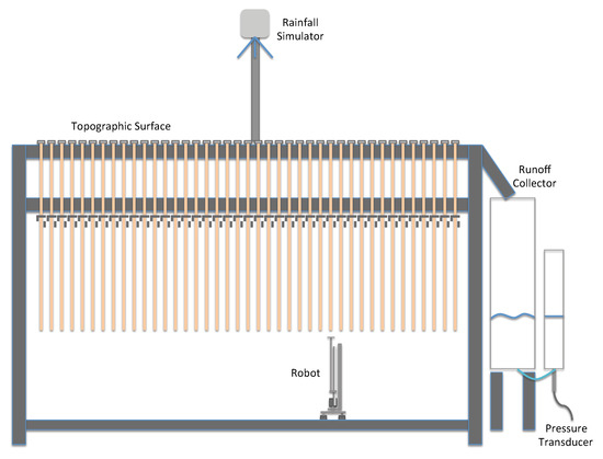 The complete model is comprised of four main parts: topographic surface, gantry robot, rainfall simulator, and runoff collector (see Figure 1).
