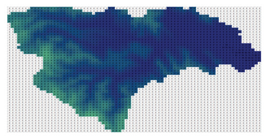 The DEM of the sampled area was obtained from INEGI [32] with a pixel size (X, Y) of 15 m. Each watershed selected represented a topographic sample, and for each sample, the DEM information was processed using ArcGIS 10 by ESRI (see Figure 4) and Excel 2010 by Microsoft (see Figure 5) to obtain an adequate format to feed the robot. The elevations matrix obtained through the processing of the DEM data was validated through a Visual Basic (VB) code (see Appendix B) that colored each cell according to the elevation in order to confirm that the arrangement agreed with the original watershed information (see Figure 5). The scaled matrix in cm, as in the physical model, was imported to ArcGIS to be processed and to obtain the morphologic parameters of the scaled watershed. Once the data were arranged in matrix form, they were then formatted into the Arduino language to be read by the controller of the robot.