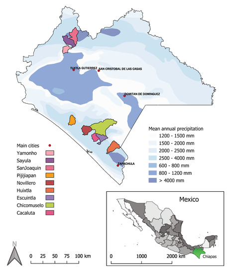 - INEGI. Anuario Estadístico y Geográfico de Chiapas; Gobierno del Estado de Chiapas: Tuxtla Gutierrez, Mexico, 2017. [Google Scholar]