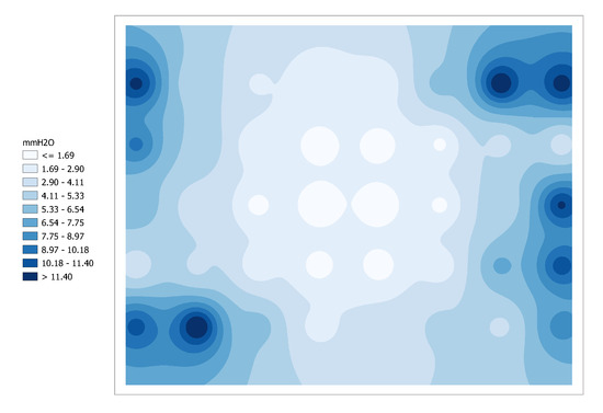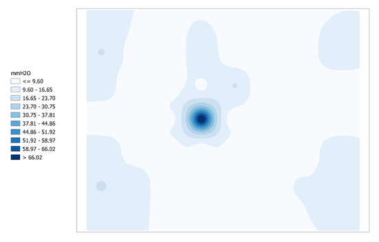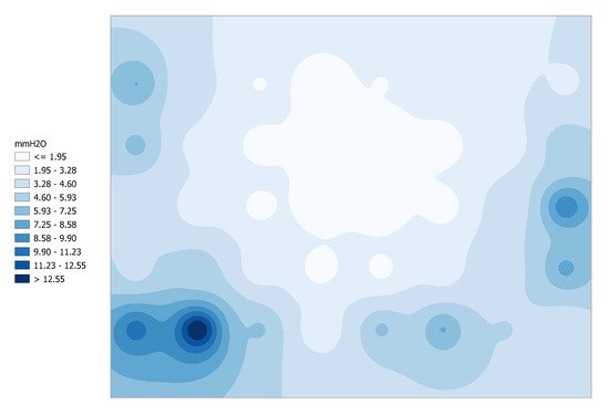 An Inverse Distance Weighting (IDW) interpolation was done in ArcGIS using the average millimeters of the water column measured at different points over the model area. The results for the 45 psi for the closed nozzle and 30 psi for the reduced nozzle configurations can be seen in Figure 7, Figure 8 and Figure 9. Each level of pressure in the different configurations is related to rainfall intensity between 39 and 141 mm/h.